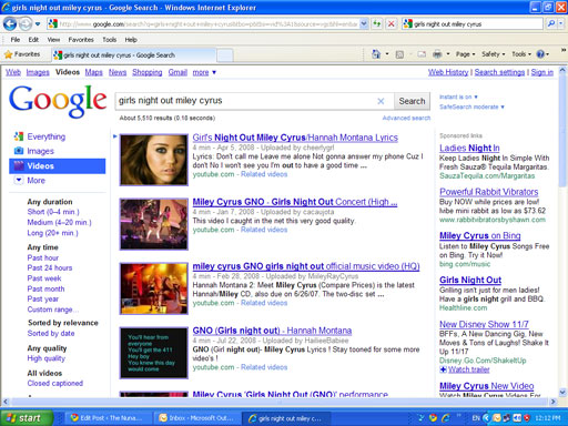 In Google Video, still on moderate, I got my biggest surprise. Turns out “Girls Night Out” is the name of a song and subsequent video by Miley Cyrus. Here is the screen shot: